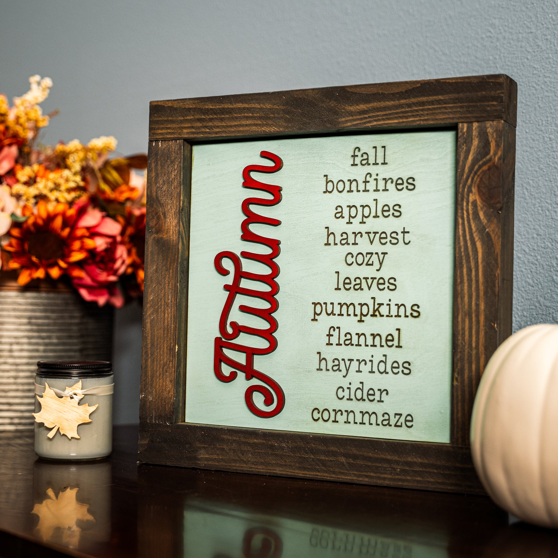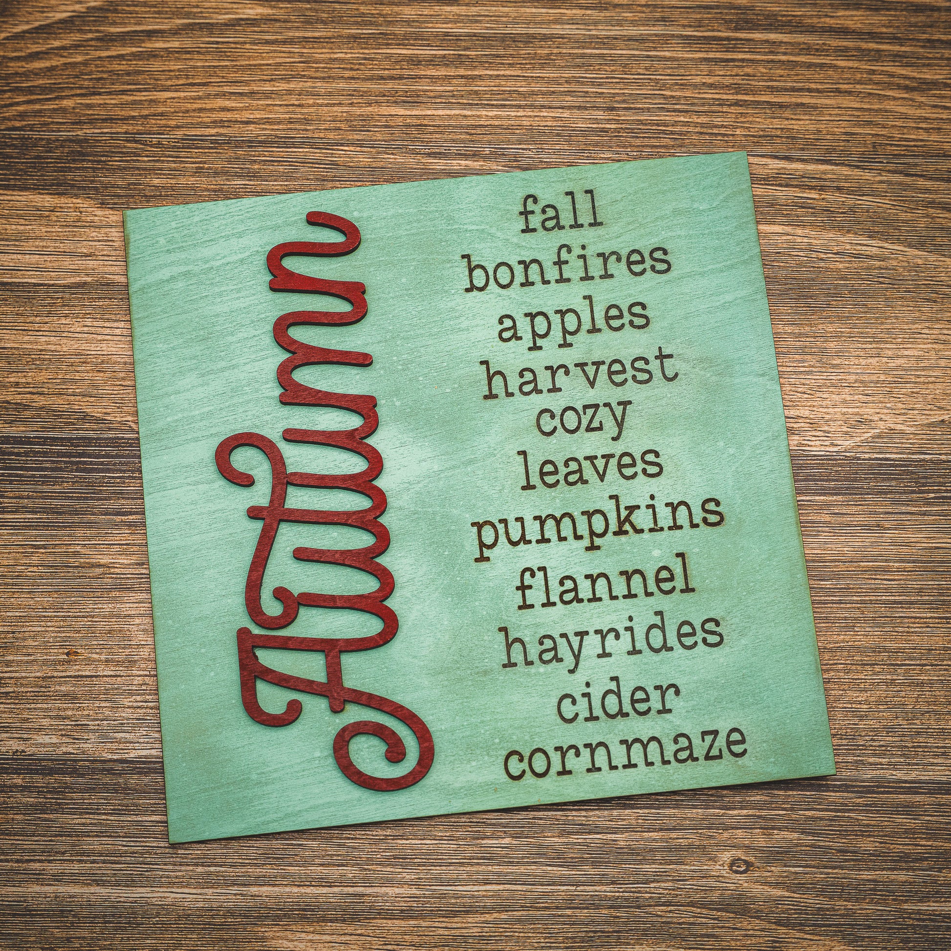 Your favorite fall words, all in one place. This tile reads like a love letter to autumn—bonfires, cider, hayrides, and everything in between. The red script “Autumn” gives it a bold pop, while the rest keeps it farmhouse classic. Made to mix and match in your ladder all season long.