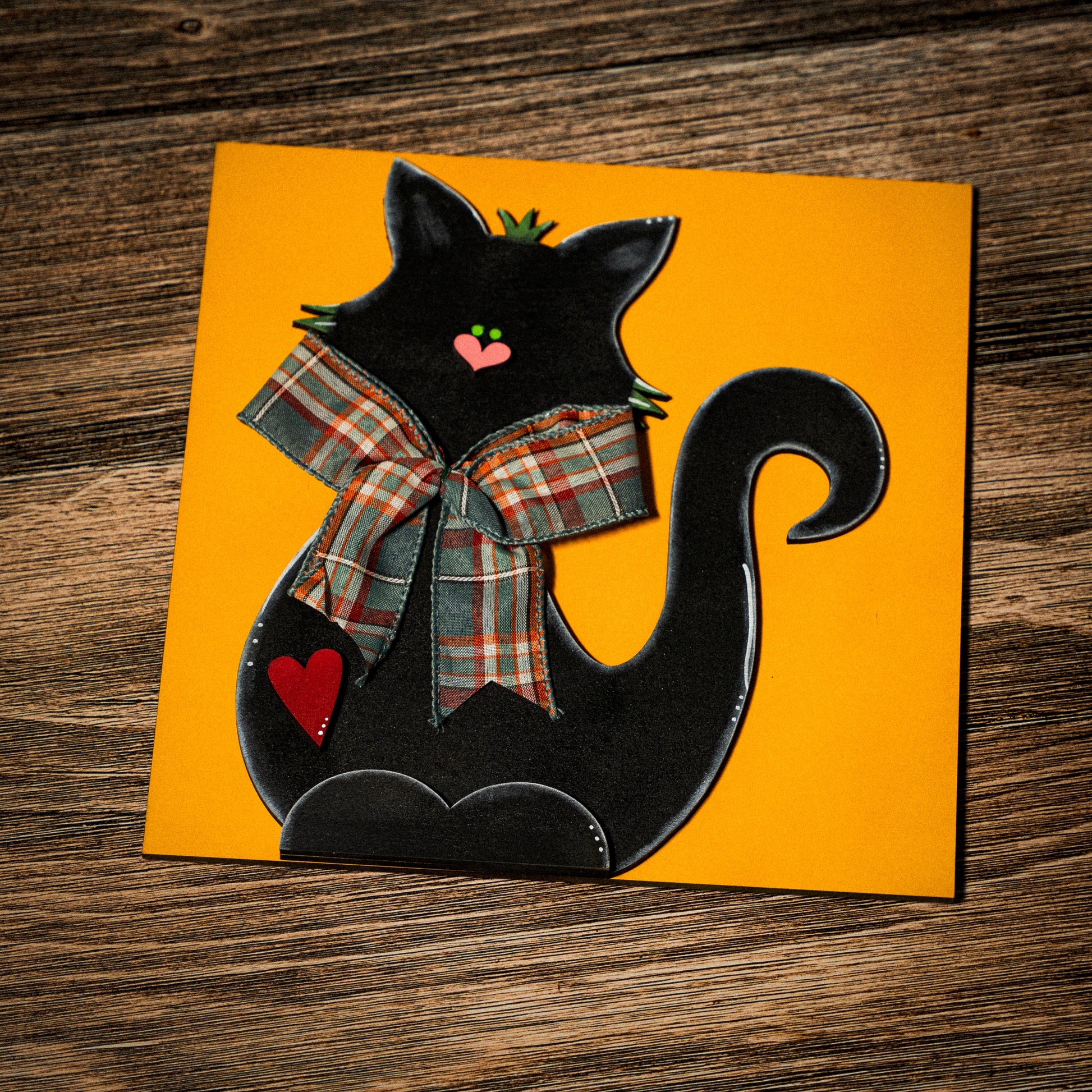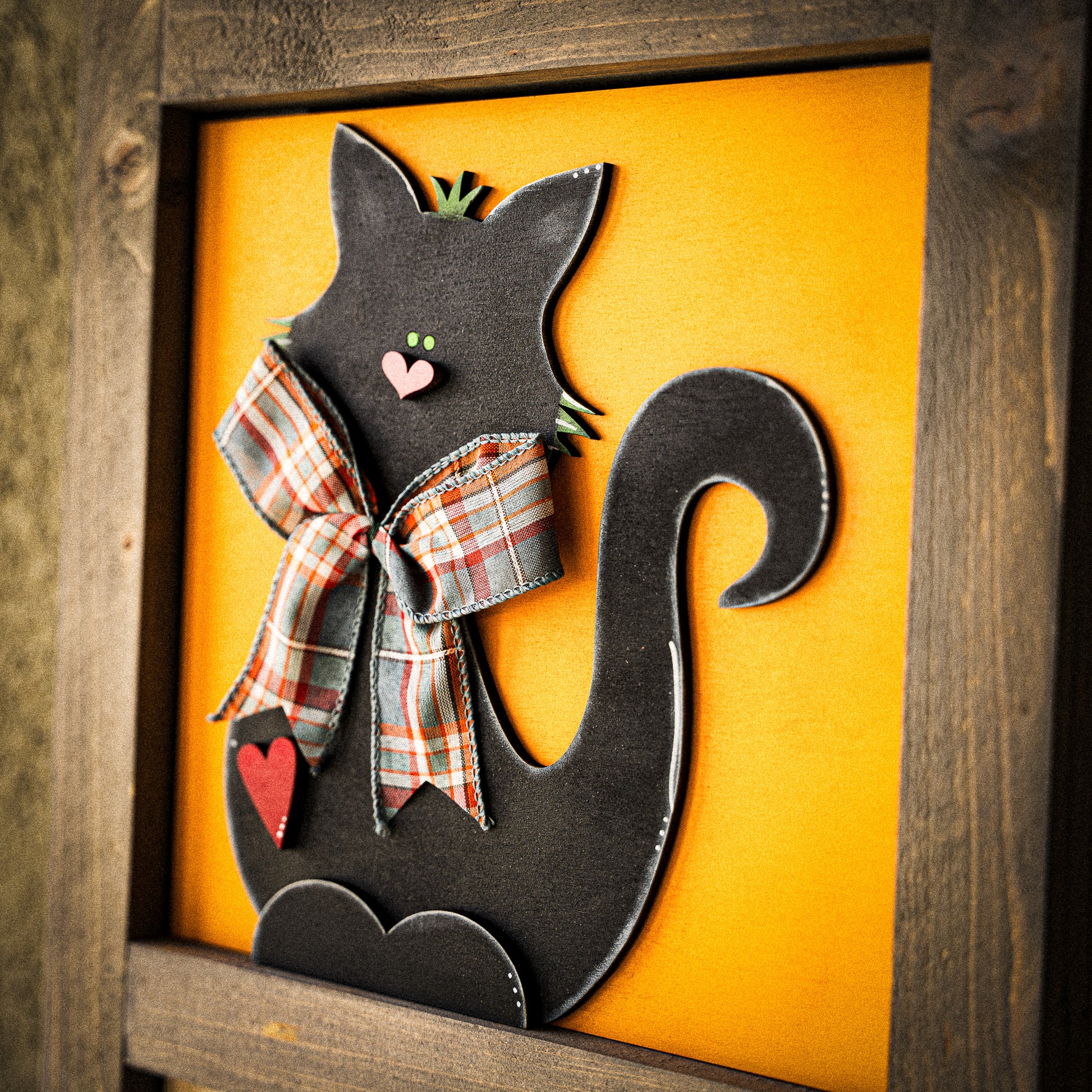 No Halloween is complete without a black cat. This handmade tile features a festive plaid bow and heart detail, making it more sweet than spooky. Perfect for porches, mantels, or entryways — sealed for indoor/outdoor use and easy to swap on your ladder.