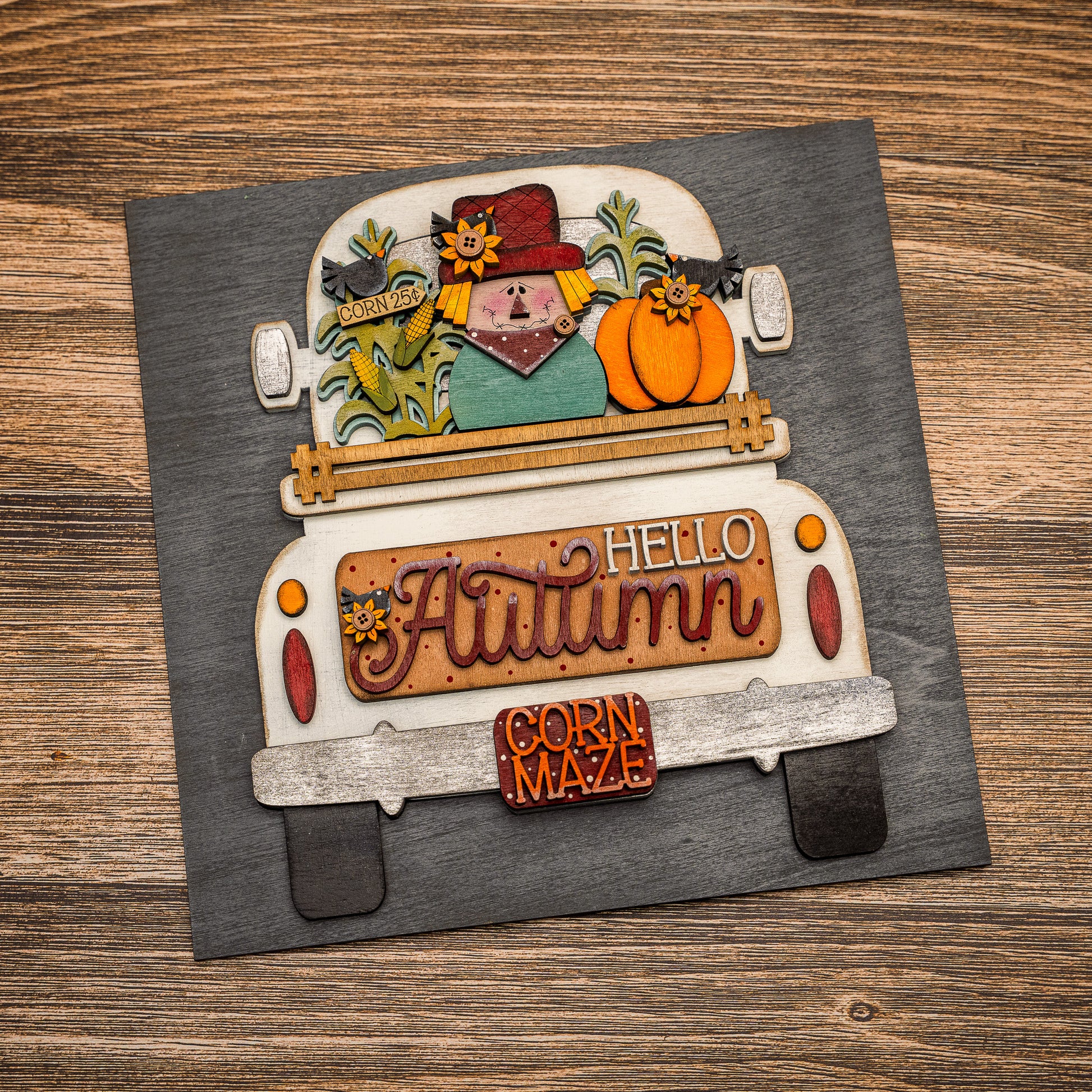 Our most detailed fall tile yet. This little white truck is packed with pumpkins, corn stalks, and one very festive scarecrow—all headed straight to the corn maze. It’s a whimsical statement piece that brings big fall energy to any room or front porch.