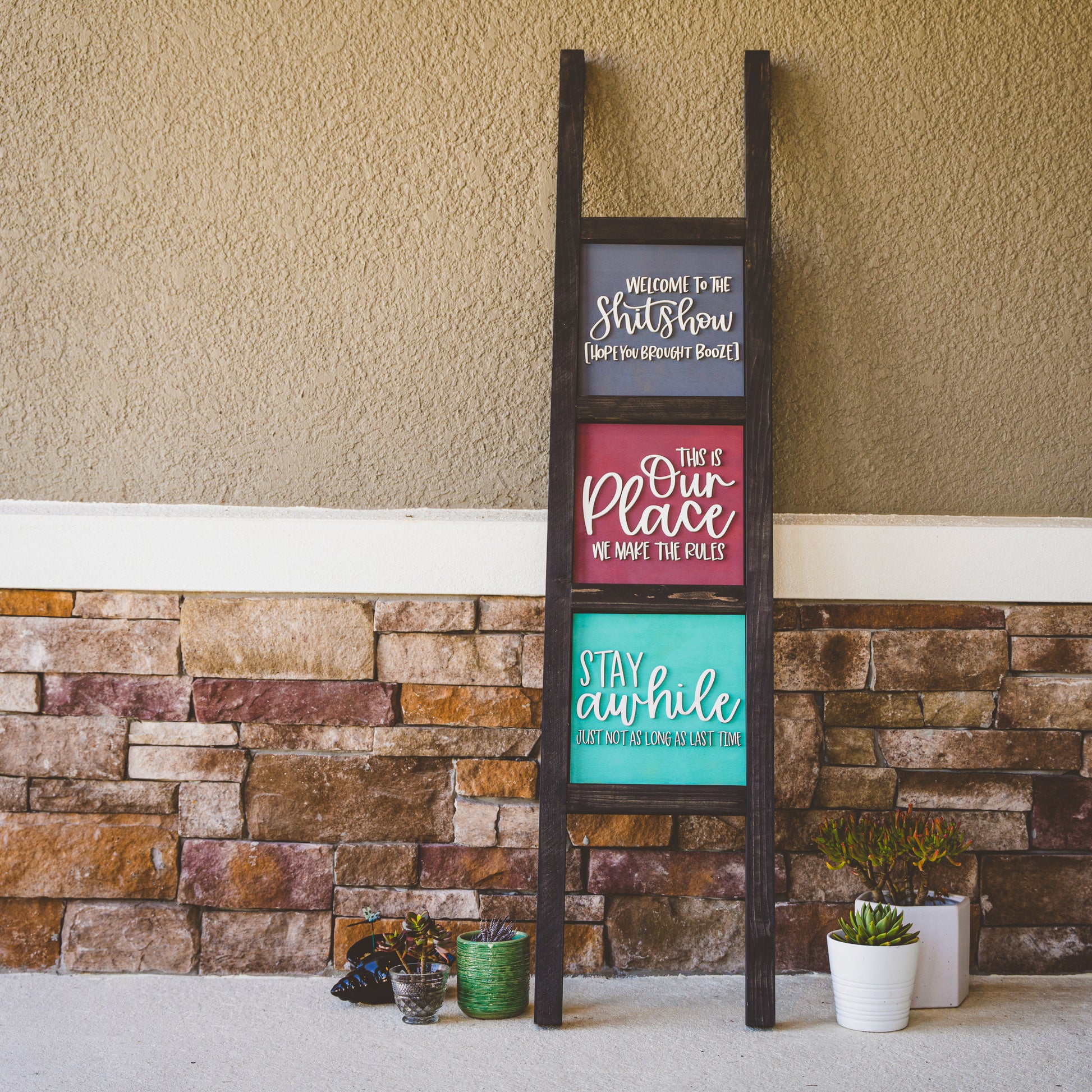 Meet your new favorite conversation starter. Our Black Interchangeable Ladder brings bold farmhouse charm with a moody twist — like that one friend who always shows up in all-black but somehow still feels cozy. Handcrafted with love (and a whole lot of attention to detail), this 5ft wooden ladder comes with your choice of any three tiles — mix and match to fit your mood, the season, or whatever story your entryway wants to tell today.