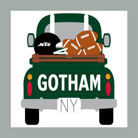 Show your New York pride in farmhouse style. Our Jets Truck Tile features a vintage red pickup loaded with footballs, a helmet, and your team’s name loud and proud across the tailgate.