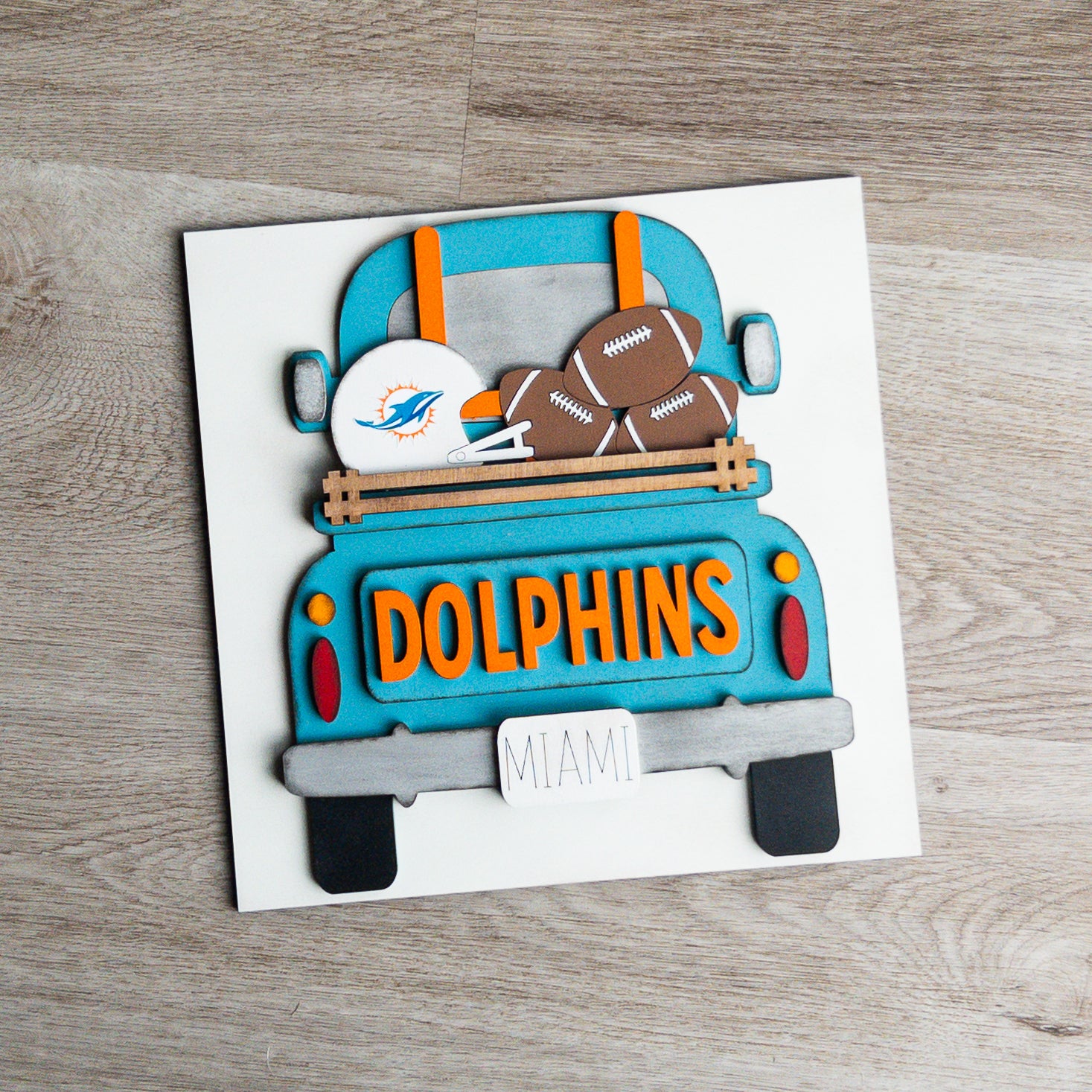 Show your Phins pride in farmhouse style. Our Miami Truck Tile features a vintage red pickup loaded with footballs, a helmet, and your team’s name loud and proud across the tailgate.